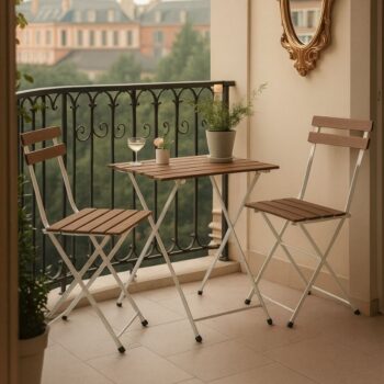 Designed for gardens, patios, balconies, and terraces, this elegant set includes a foldable table and two matching chairs, perfect for relaxing, dining, or enjoying drinks outdoors.