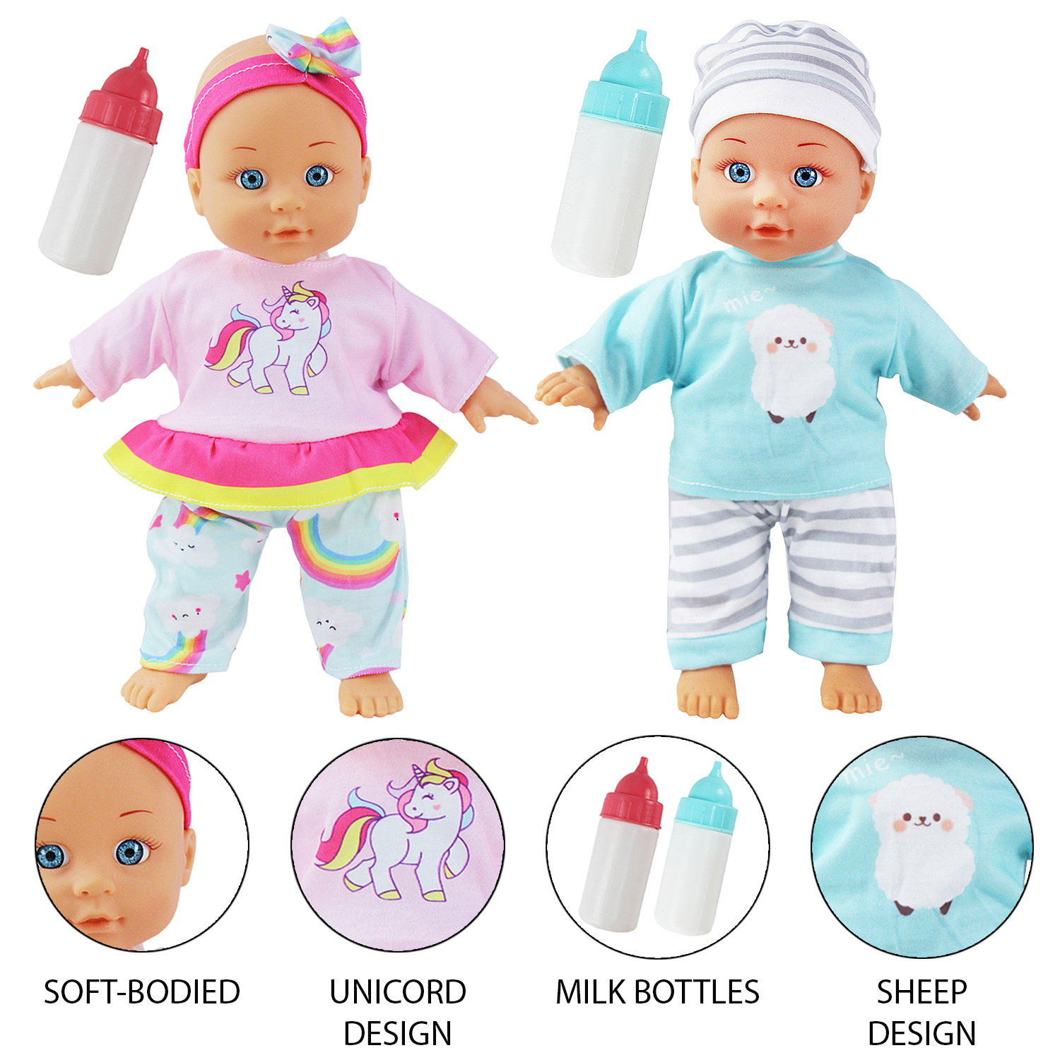 - Pink Style: Comes in unicorn-themed pyjamas with a matching pink and rainbow bow headband and a pink bottle.