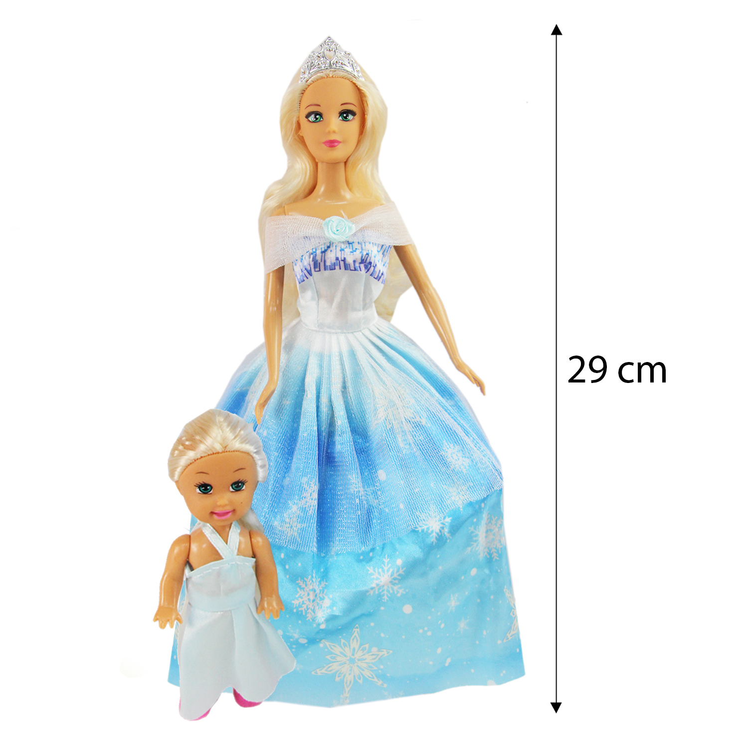 This set includes a 30cm princess doll dressed in a beautiful blue and white gown with a tiara, along with her “little sister,” a 13cm princess doll in a matching outfit.